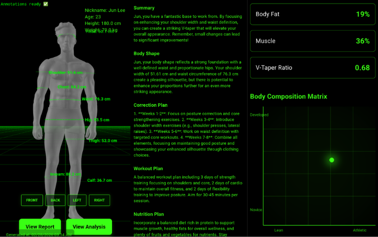 A detailed analysis of your posture, symmetry, and key body measurements from a single scan.